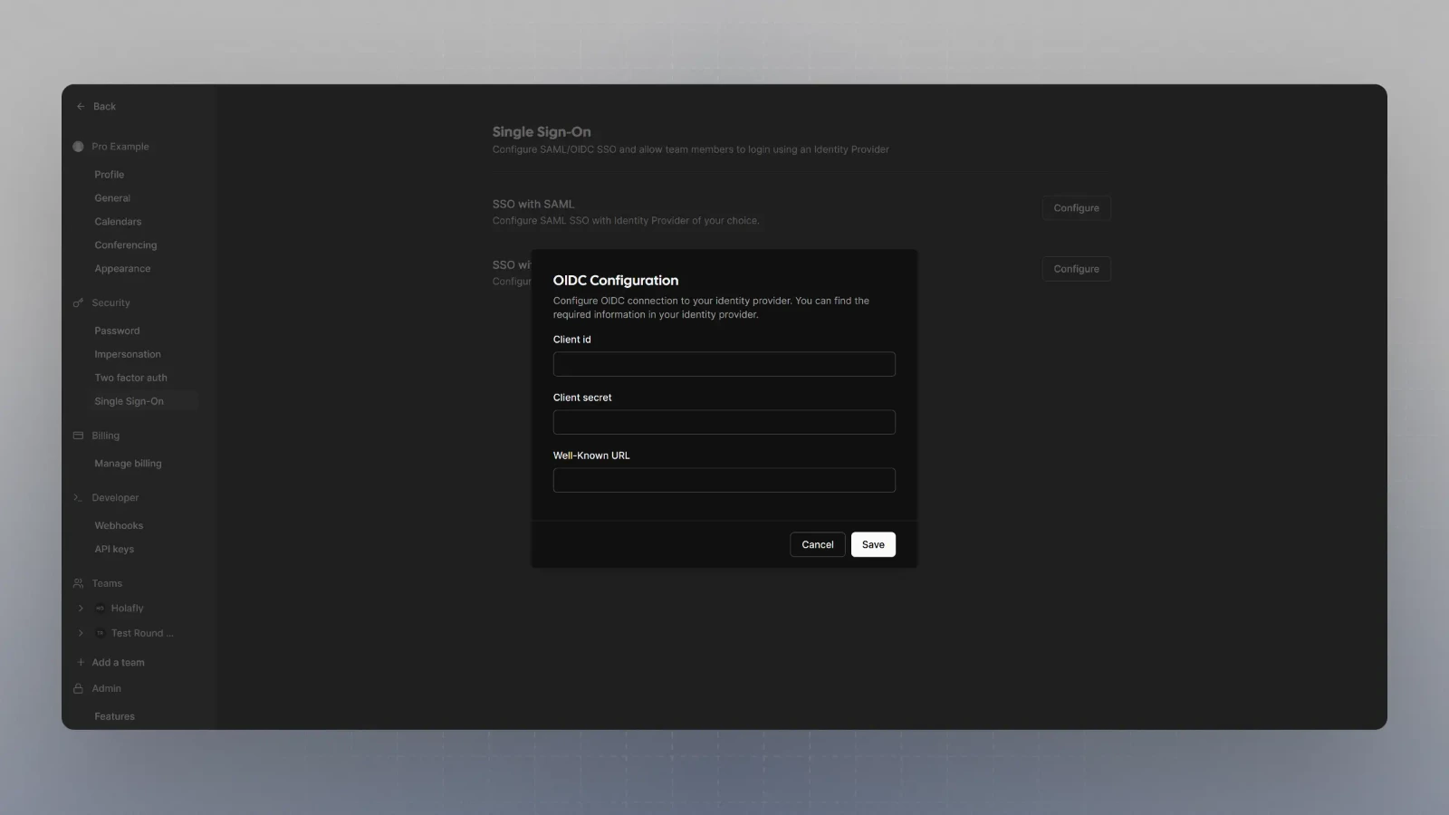 10. Click on Configure SSO with OIDC, and then enter the Client Secret, Client ID and Well known URL from the Step 7, and click save.